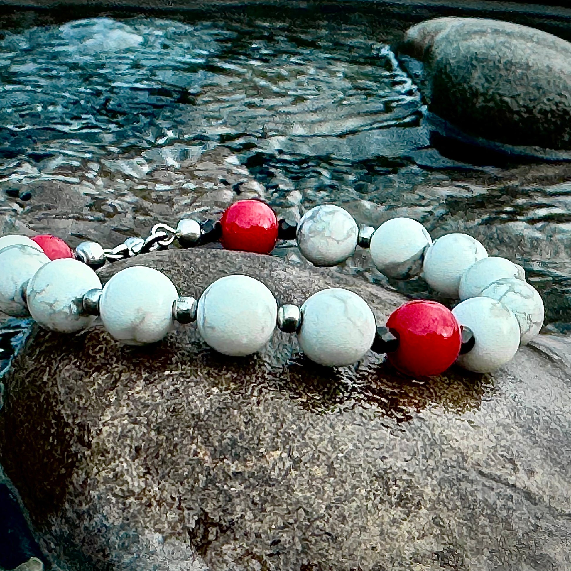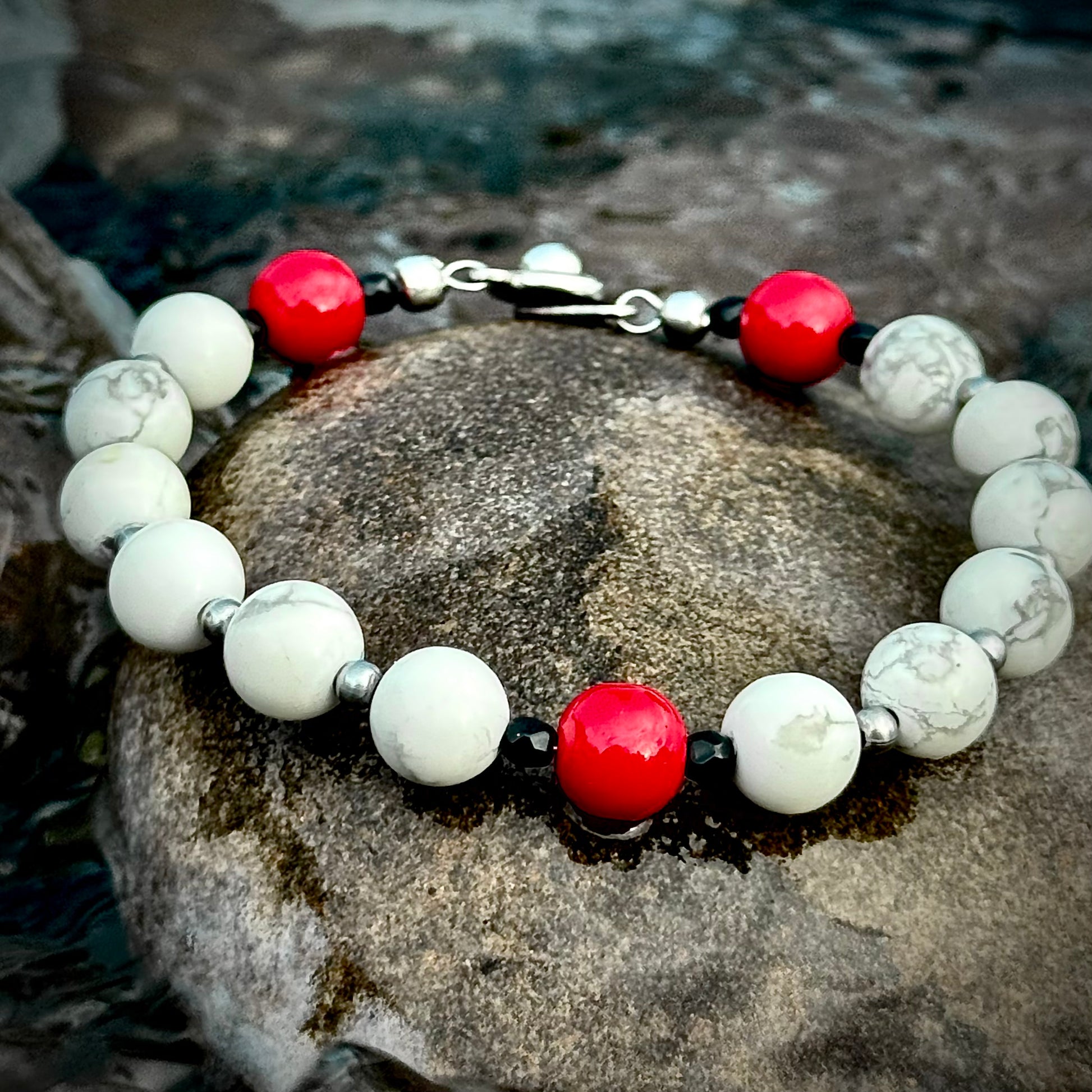 This is our Woosah bracelet. It’s a nudge to take it easy and stay focused at the same time. Named after that ‘Woosah’ moment from Bad Boys the movie, as well as a nod to martial arts wisdom. It features white howlite, a red ceramic centerpiece, and black spacers representing the balance of being easy, and also using your will to be disciplined. In the words of Harrpy Palmer, let this Spirit Link remind to “Stay Awake…and Relax!”