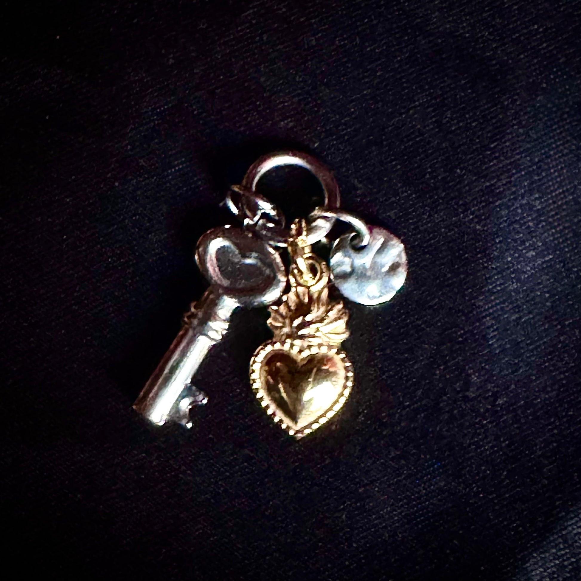 FLAMING HEART, KEY, TING COIN TRIAD in MIXED METALS
